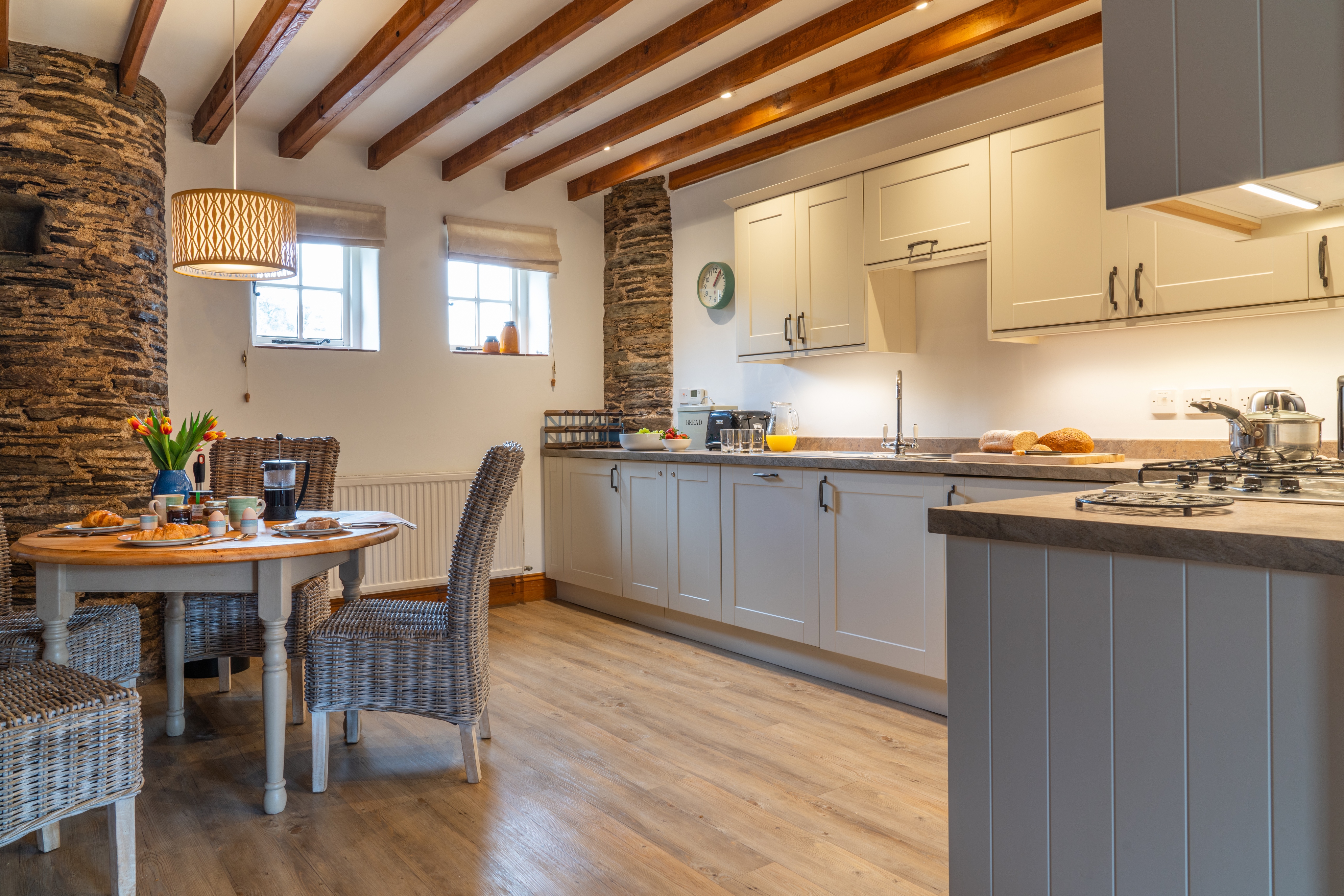 The modern kitchen contains everything you’re likely to need to cater for your whole family during your stay. And includes a dining area with comfortable wicker chairs and beautiful exposed brick work.