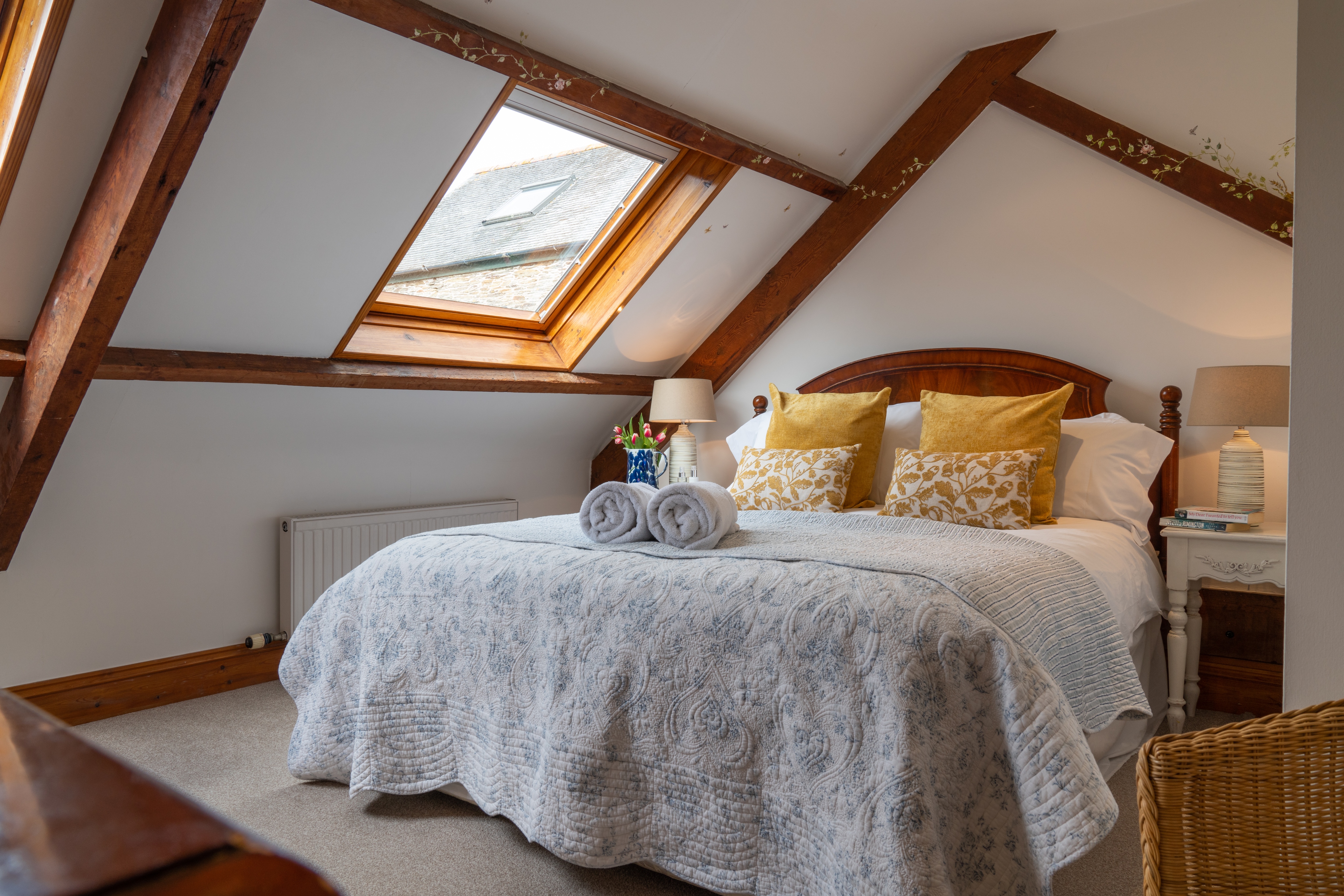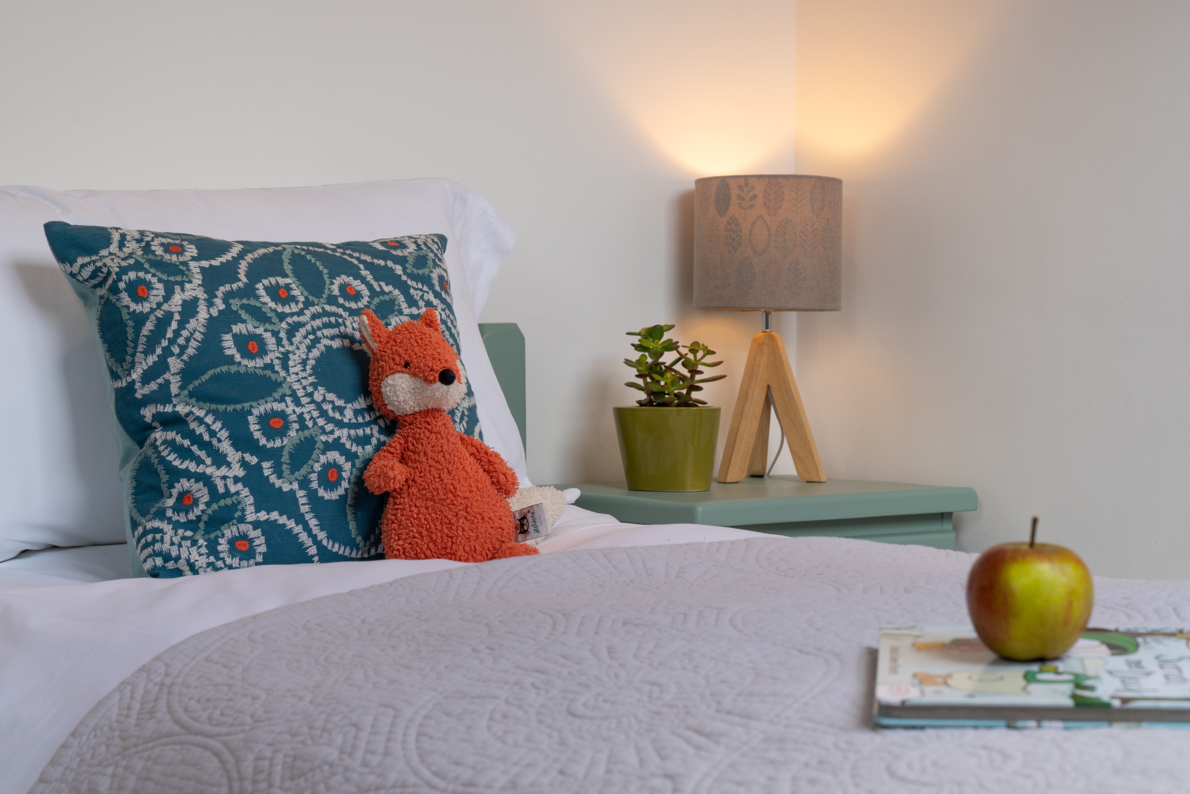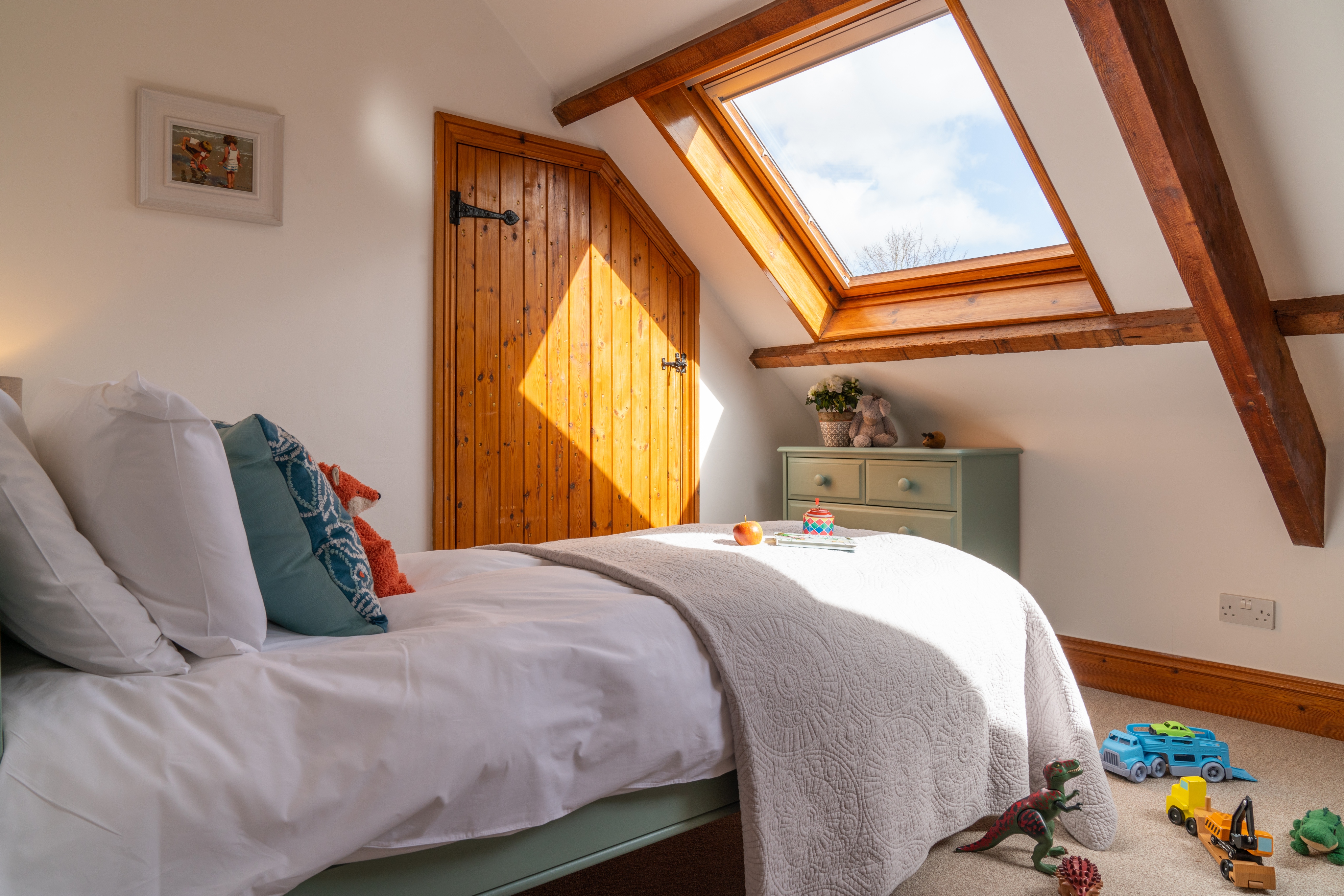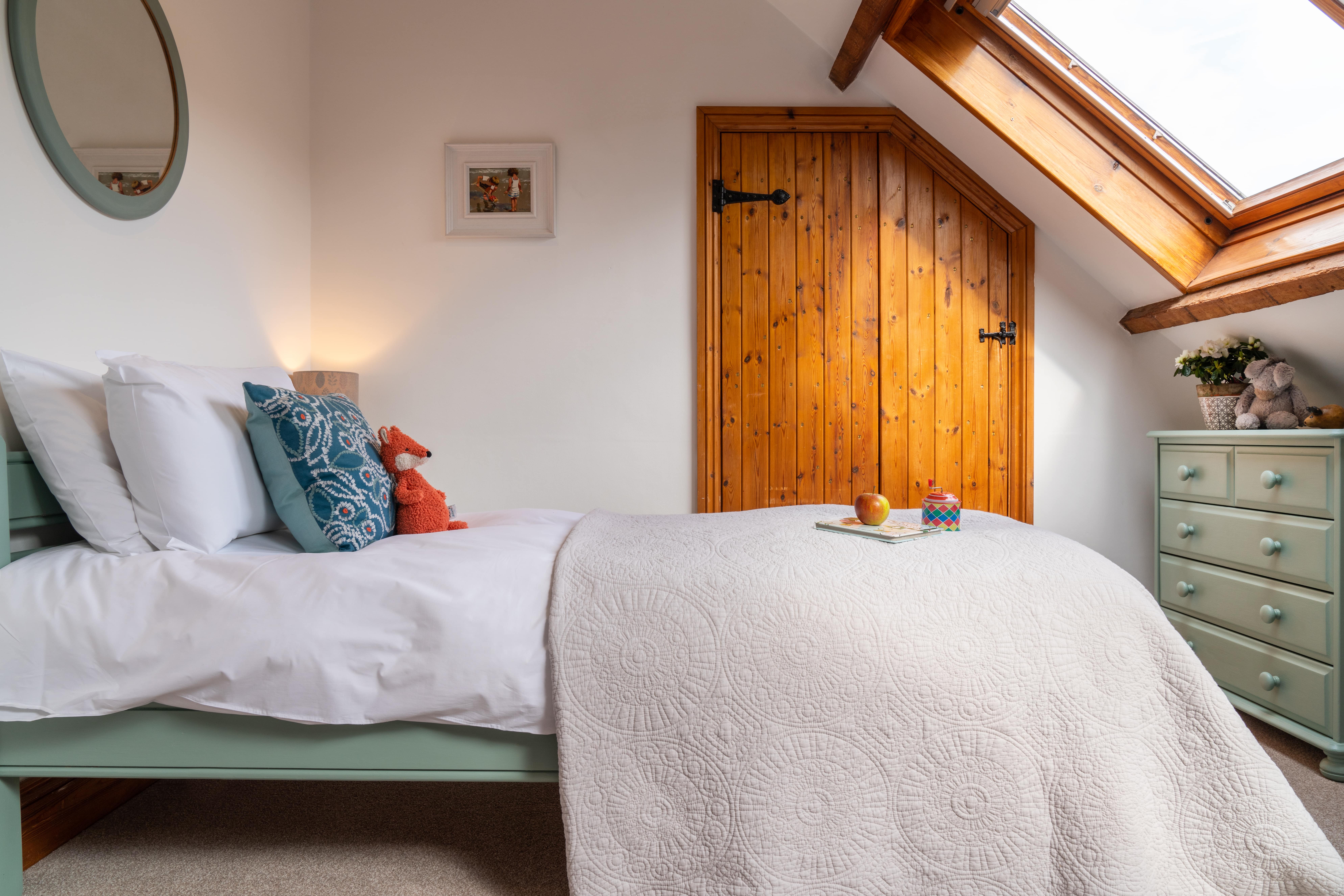 Upstairs you’ll find a light and comfortable master bedroom, modern bathroom and lovely twin bedroom. All with comfortable beds and nice plump pillows. If you need an additional cot, high chair or stair gate we’ll be happy to provide it.