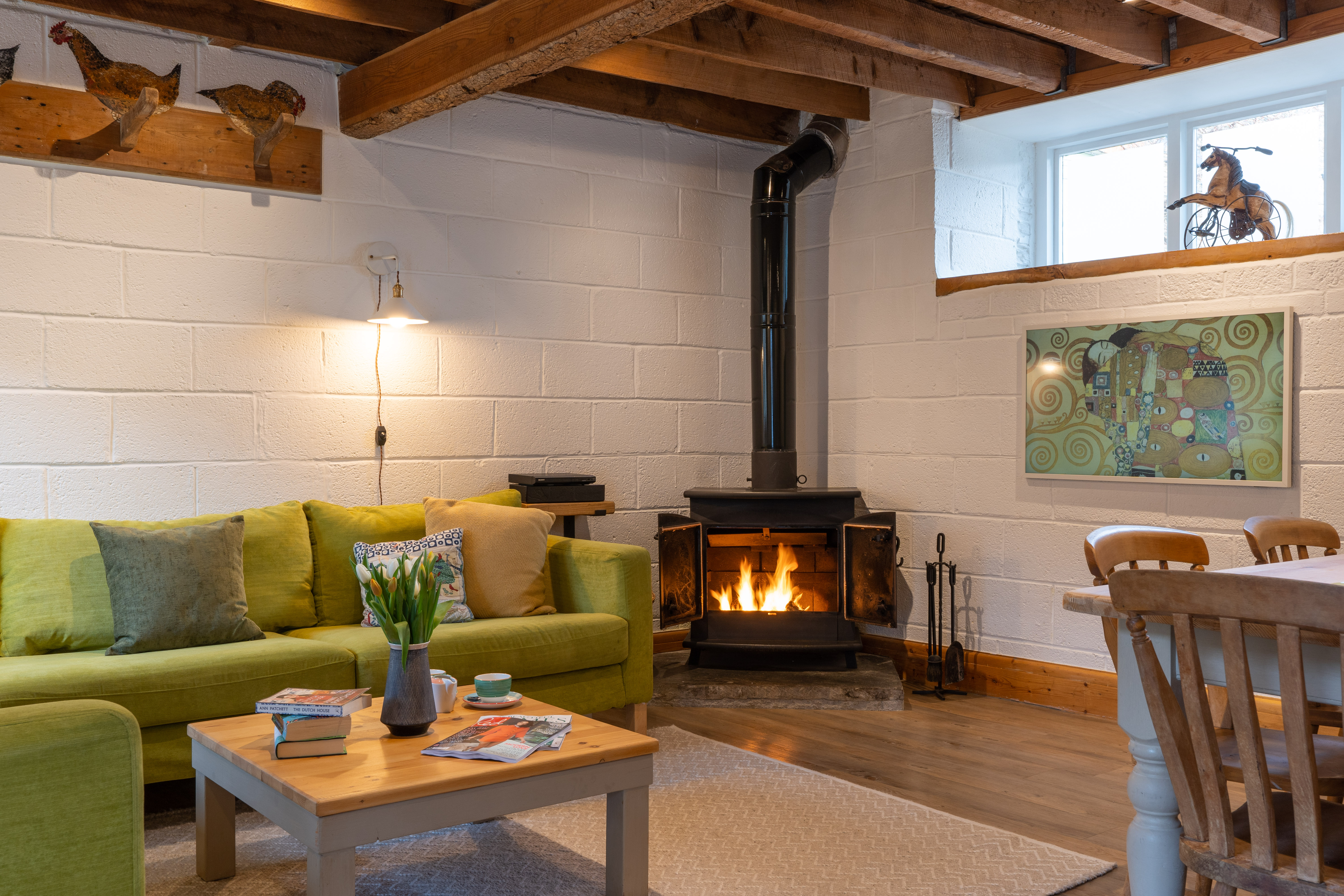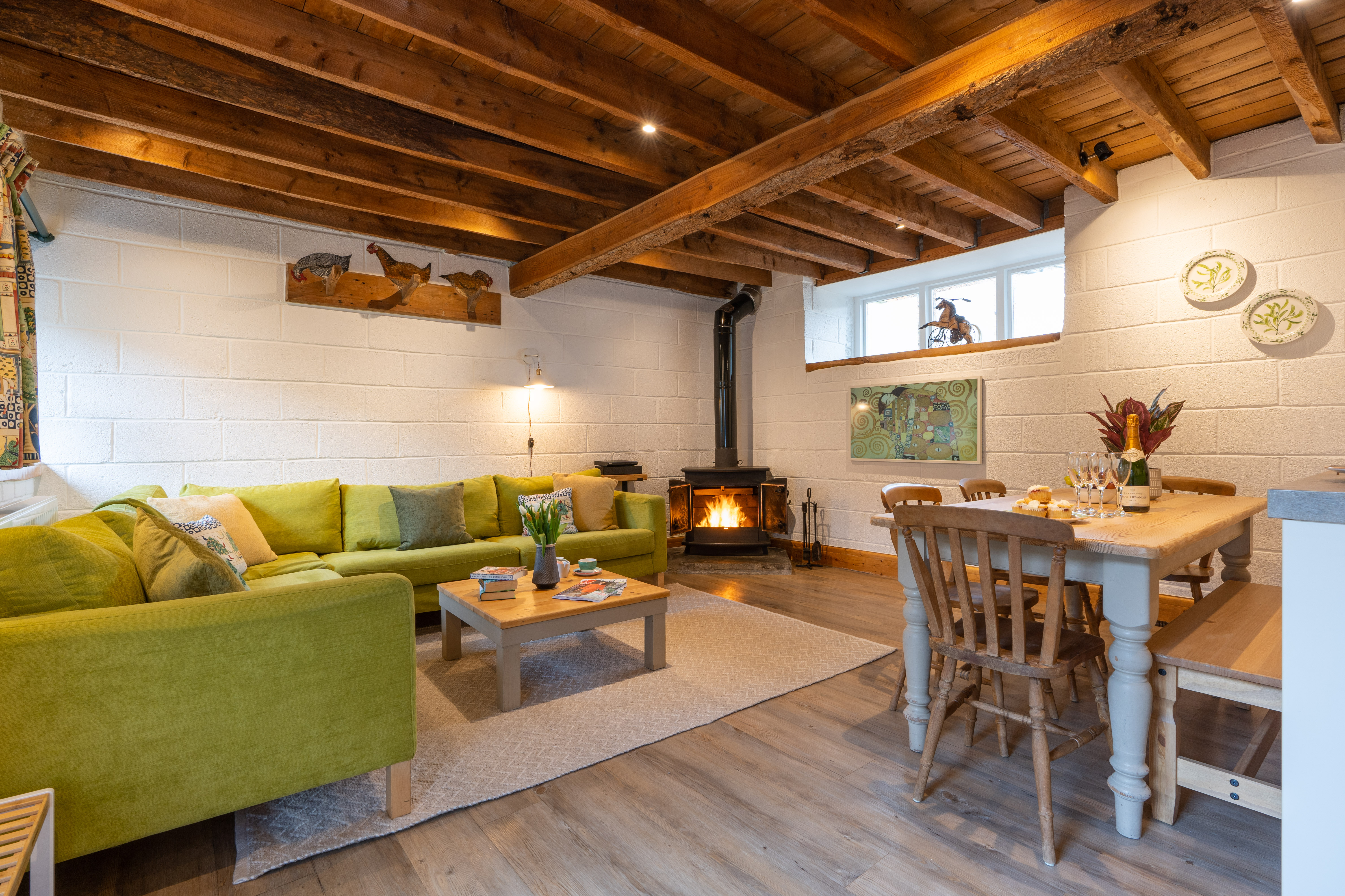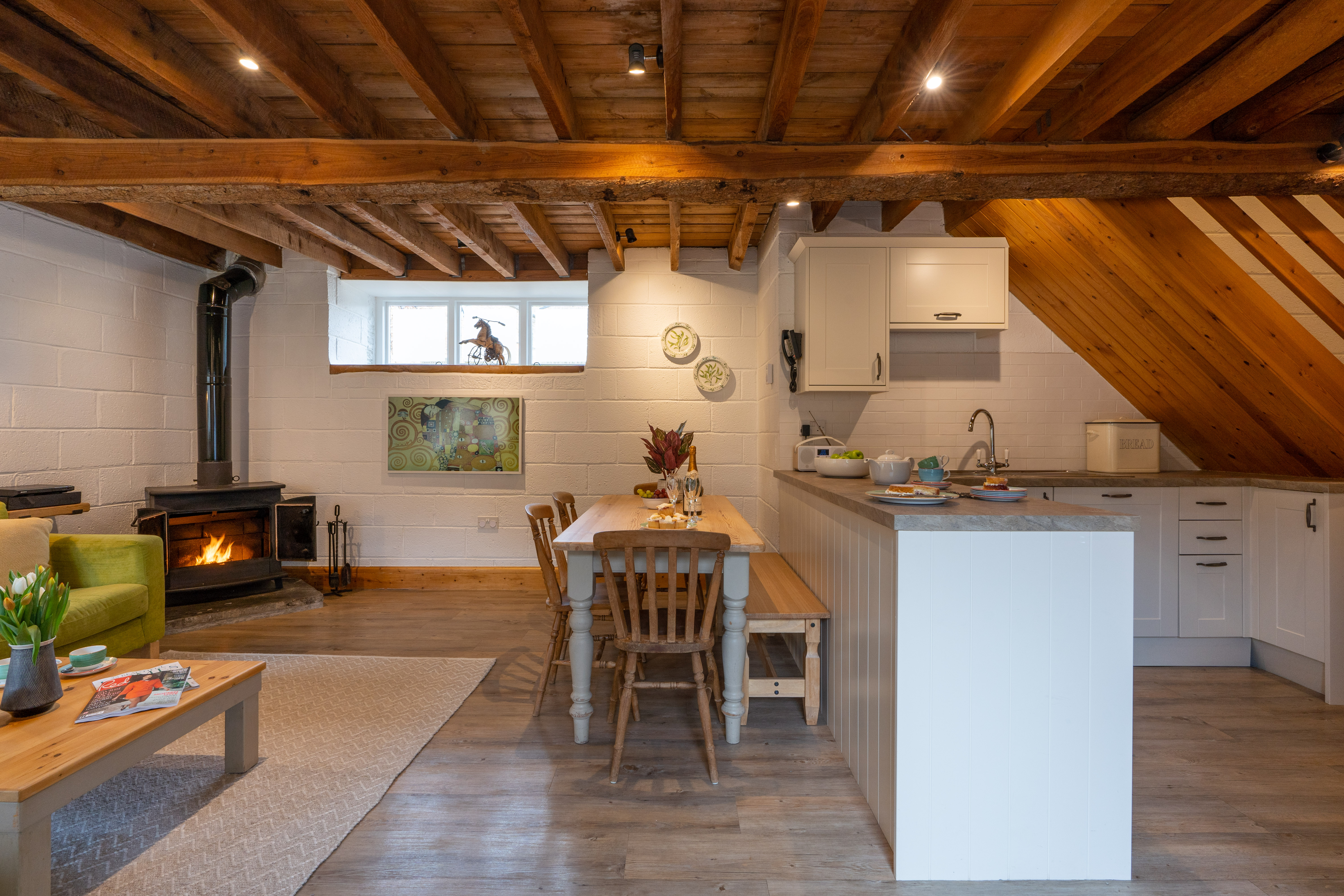 Sleeping up to 6, The Stalls is your cosy countryside retreat with room to spread out. The traditional stable door opens into an open-plan living space—Shaker-style kitchen on one side, comfortable living and dining on the other. The rustic wood-burner is perfect for those evenings when you've explored enough and just want to settle in together.