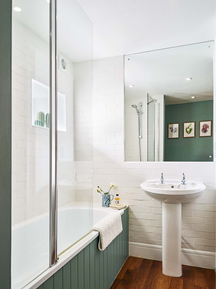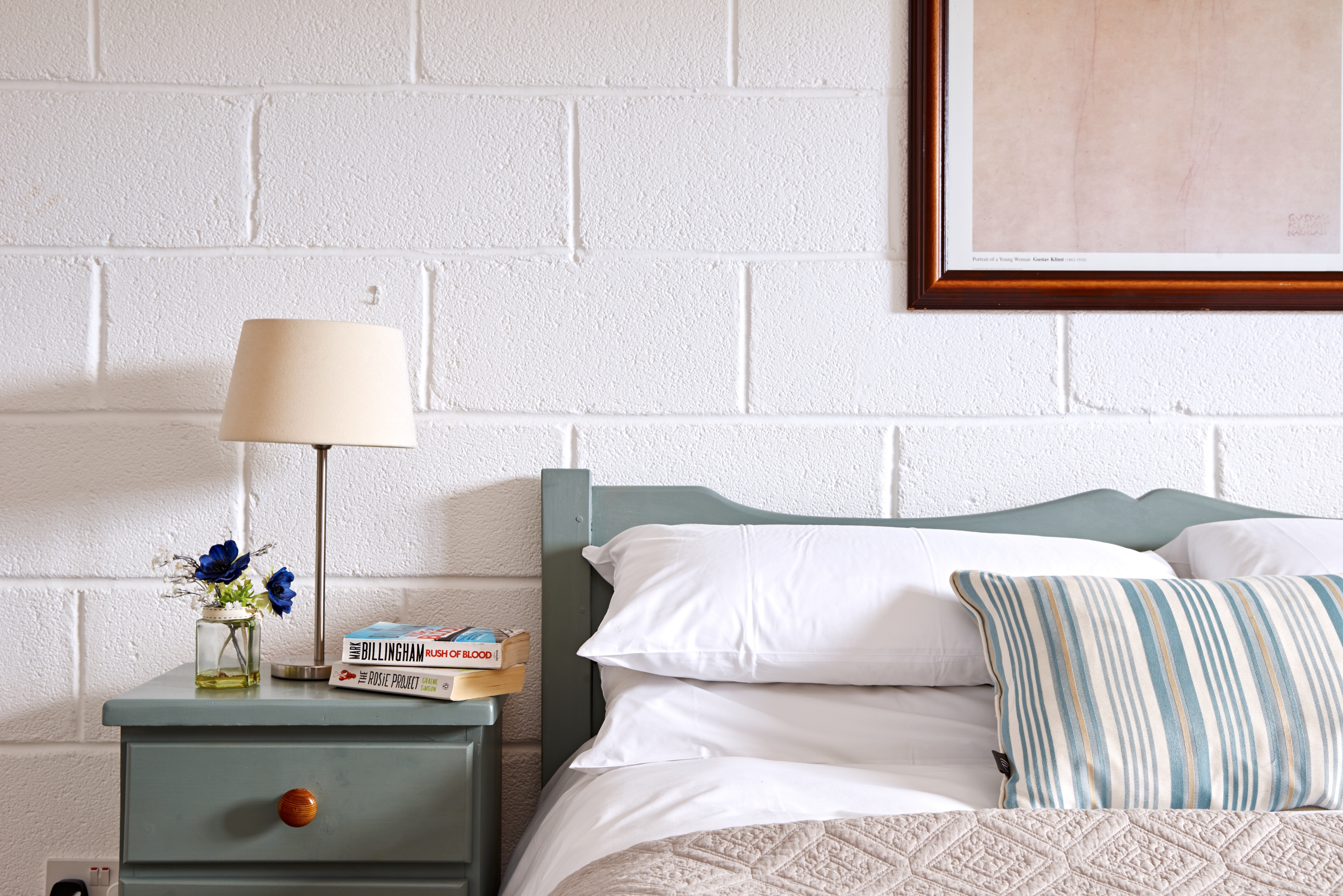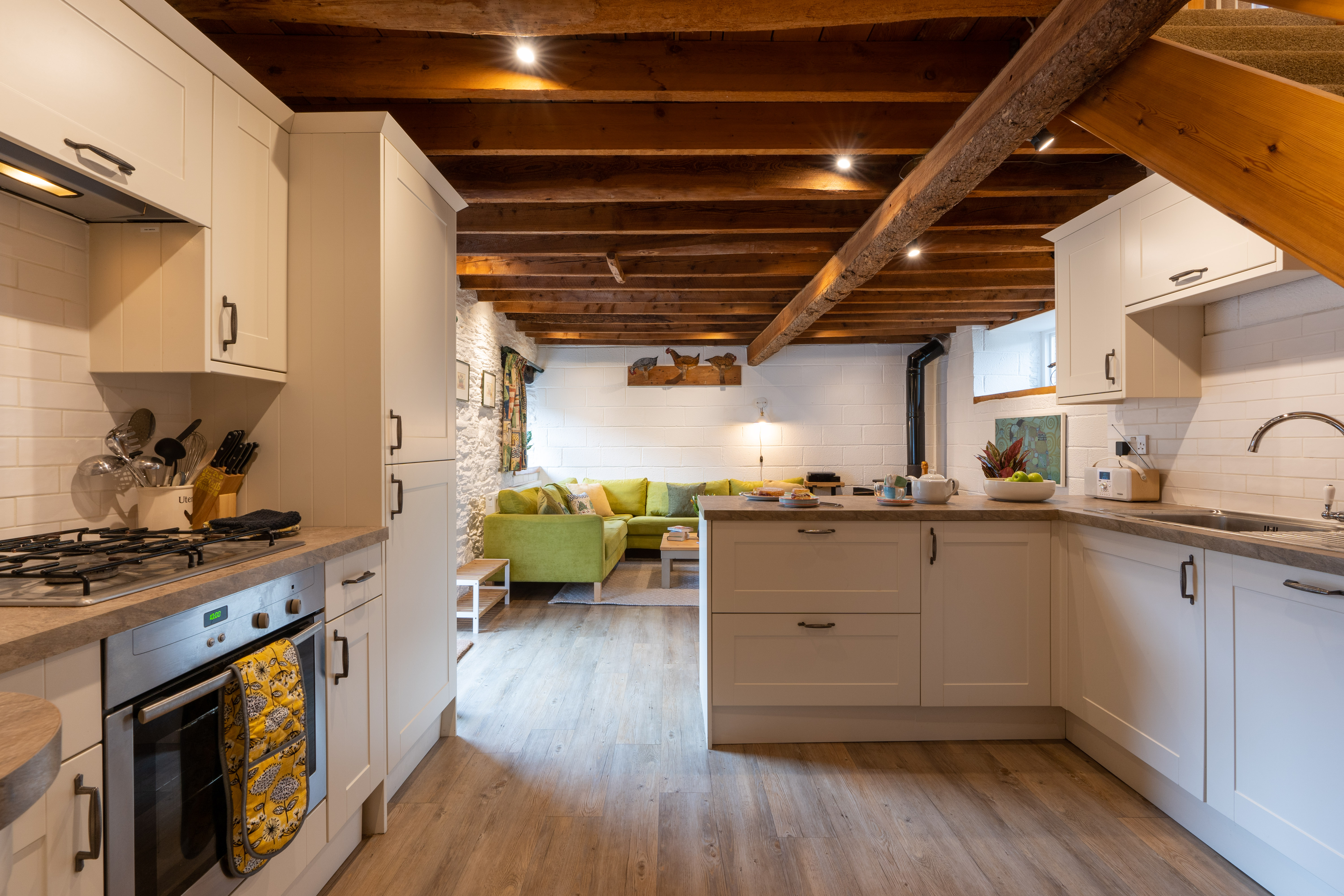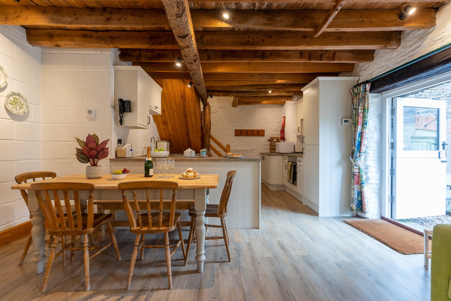 Sleeping up to 6, The Stalls is your cosy countryside retreat with room to spread out. The traditional stable door opens into an open-plan living space—Shaker-style kitchen on one side, comfortable living and dining on the other. The rustic wood-burner is perfect for those evenings when you've explored enough and just want to settle in together.